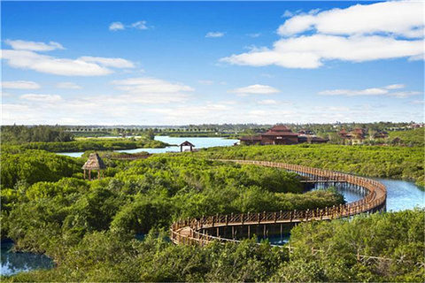富力红树湾湿地公园坐落于海南北区的澄迈县,紧邻海南省会海口,距离海口机场约40分钟的车程,更有人称它为“海口的后花园”。这里融红树湾湿地景观、珍贵鸟类、各种休闲娱乐中心于一体,空气清新,风景宜人。沿着园区内4.2公里长的原木栈道步行游览,便可尽览一望无际的“水上森林”,它们树根盘错,根植于水底淤泥之中,绿叶繁密,充满生机。除了红树林湿地,这里很值得看的还有火烈鸟岛上那成群结队的“红精灵”,看它们姿态优雅,自由自在,也是别有一番滋味。