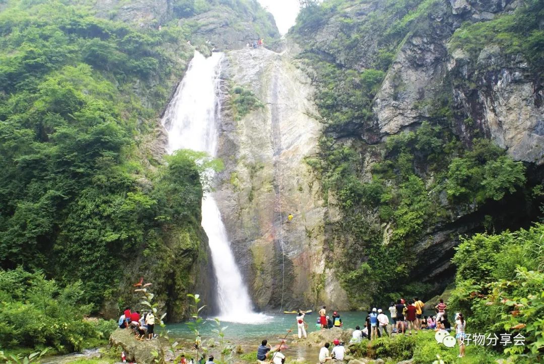 一幅巨大水帘高挂中天,半遮崖壁洞口,欲现还羞,说是当年齐天大圣的水帘洞,故名水帘洞瀑布。瀑布下注成潭,清澈如镜,可供戏水。