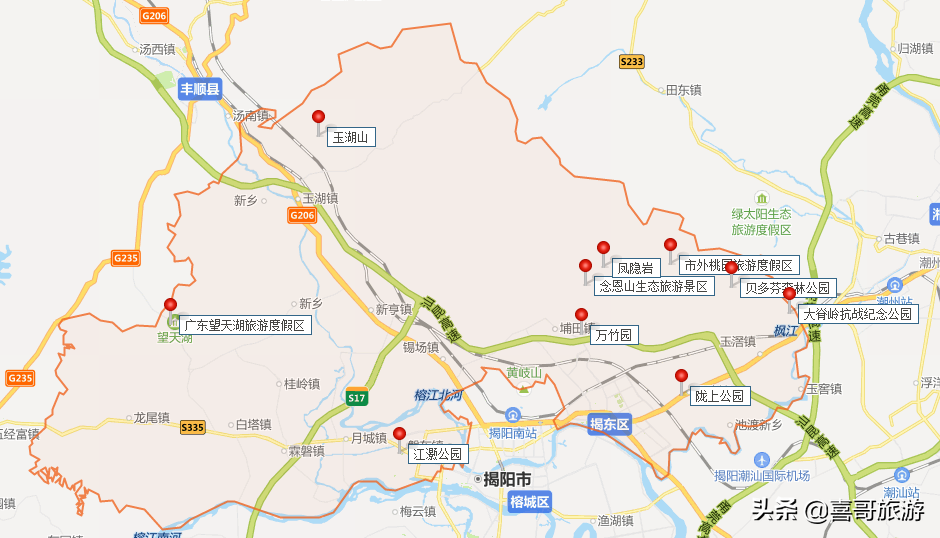 3、一次性自驾游玩揭阳市揭东区以上值得游玩的景点,推荐行程路线:揭阳市揭东区-陇上公园-大脊岭抗战纪念公园-贝多芬森林公园-市外桃园旅游度假区-凤隐岩-念恩山生态旅游景区-万竹园-玉湖山-广东望天湖旅游度假区-江灏公园-揭阳市揭东区。