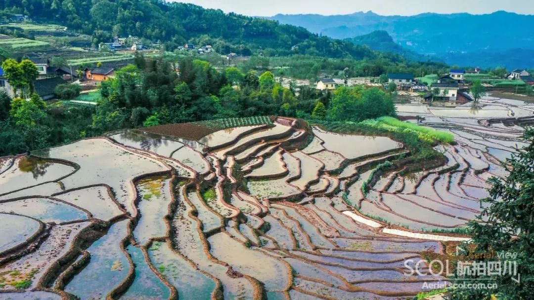 群山环抱中的千亩农田层层叠叠,纵横交错,形态各异,犹如画家笔下的一幅山水画卷。那山、那屋、那梯田,犹如诗人笔下的一首田园诗歌。