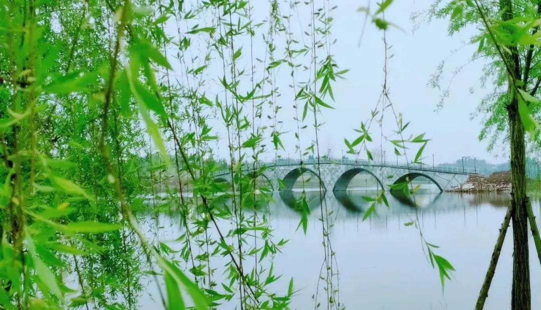 平静的湖面上,廊桥横跨、栈道点缀、鸟声啼啭,描绘出诗情画意的自然画卷。蜿蜒的小道旁,林立的乔木郁郁葱葱,成片的鲜花迎风绽放,谱写出生机盎然的田园诗歌……