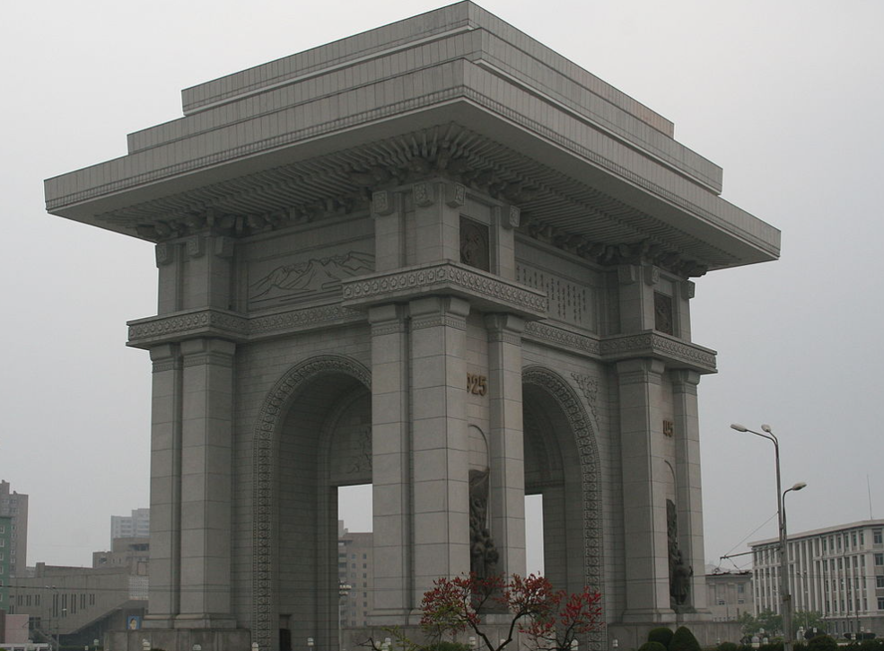 而在平壤市内,与统一拱门齐名的,便是朝鲜著名的“凯旋门”。朝鲜凯旋门效仿法国巴黎凯旋门修建,但工程总量却远高于巴黎凯旋门,创下当今世界凯旋门修筑工程量之最。该凯旋门共动用了10500块花岗岩,总体高60米,宽52.5米,共有4根花岗岩石柱,于1982年正式完工。该凯旋门的修筑是为了庆祝抗美援朝战争的胜利,以及朝鲜获得独立自主并建立社会主义国家。