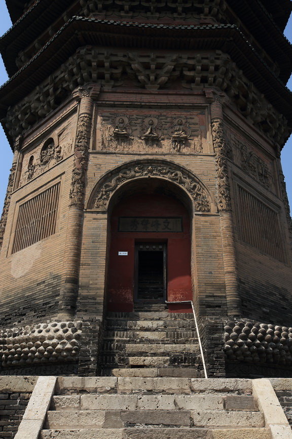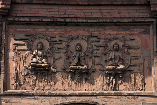 第一层塔身较高,其门窗、倚柱等处浮雕盘龙、二龙戏珠、花卉、卷云等图案,每面额枋下均有浮雕画,内容为佛像和佛传故事。