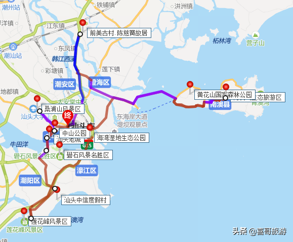 2、广东汕头十大景点自驾游行程路线:广东汕头-桑浦山风景区-中山公园-汕头老城-礐石风景名胜区-汕头中信度假村-莲花峰风景区-汕头海湾-黄花山国家森林公园-南澳岛生态旅游区-陈慈黉故居-广东汕头。